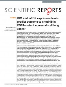 BIM is a proapoptotic protein that initiates apoptosis triggered by EGFR tyrosine kinase inhibitors (TKI). mTOR negatively regulates apoptosis and may influence response to EGFR TKI. We examined mRNA expression of BIM and MTOR in 57 patients with EGFR-mutant NSCLC from the EURTAC trial. Risk of mortality and disease progression was lower in patients with high BIM compared with low/intermediate BIM mRNA levels. Analysis of MTOR further divided patients with high BIM expression into two groups, with those having both high BIM and MTOR experiencing shorter overall and progression-free survival to erlotinib. Validation of our results was performed in an independent cohort of 19 patients with EGFR-mutant NSCLC treated with EGFR TKIs. In EGFR-mutant lung adenocarcinoma cell lines with high BIM expression, concomitant high mTOR expression increased IC50 of gefitinib for cell proliferation. We next sought to analyse the signalling pattern in cell lines with strong activation of mTOR and its substrate P-S6. We showed that mTOR and phosphodiesterase 4D (PDE4D) strongly correlate in resistant EGFR-mutant cancer cell lines. These data suggest that the combination of EGFR TKI with mTOR or PDE4 inhibitors could be adequate therapy for EGFR-mutant NSCLC patients with high pretreatment levels of BIM and mTOR.